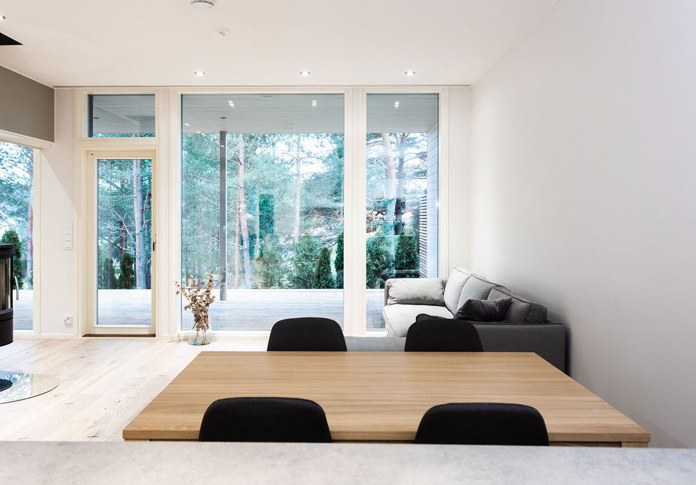 Kiintokalusteet toimitti tanskalainen laadukas Kvik. Kokonaisuus on huolella valittu, sisältäen Boschin kodinkoneet ja Savon tyylikkään liesituulettimen. Yksityiskohtia ei ole unohdettu, esimerkiksi vieras-wc:n istuin on seinämallinen Ido Geberit, suihkussa on Oras Optiman sadetinsuihku, makuuhuoneessa on liukuovi luoden avaruutta tilaan, saunassa on vaakaikkuna ulos, sekä valoa tuova lasiseinä pesuhuoneen ja saunan välillä tuovat ripauksen luksusta arkihetkiin.